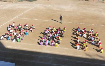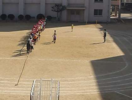 6年生が心地よい秋晴れの中、運動場で「つな引き」の練習をしています。