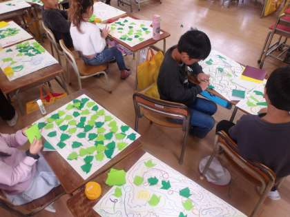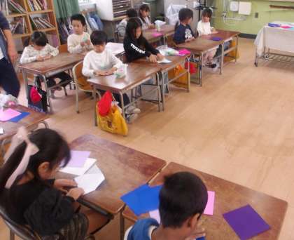 1年生が、クラスごとにおりがみを使って作品をつくっています。