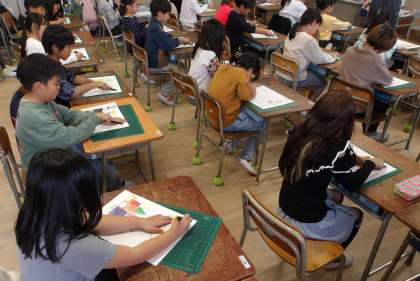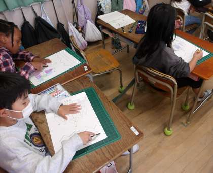 2年生が図工で、初めてカッターナイフを使う学習をしています。