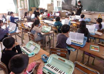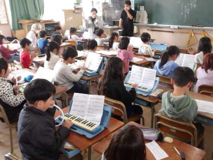 2年生が音楽で合奏で、鍵盤ハーモニカの練習をしています。