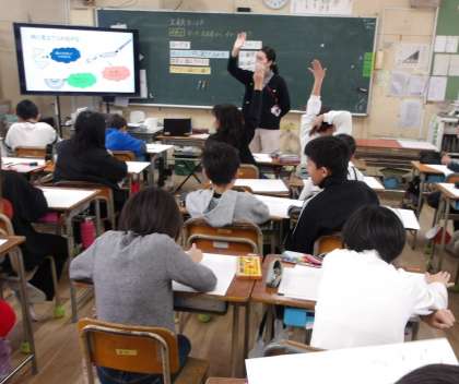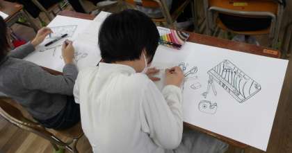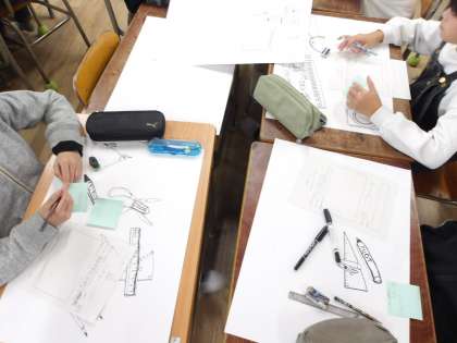 5年生が図工で、ネームペンで自分で描いたいろいろな文房具の絵の全体を、何かに見立てて新たな作品を作る学習です。