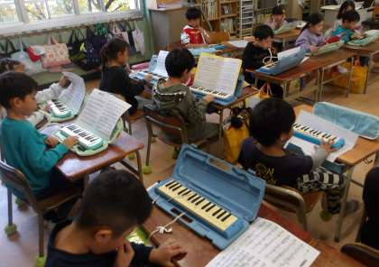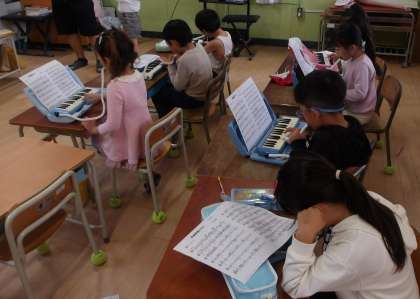 1年生が音楽で鍵盤ハーモニカの練習をしています。