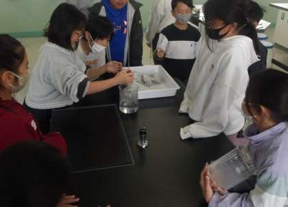 4年生が理科室で「ものの温度と体積」の実験をしています。