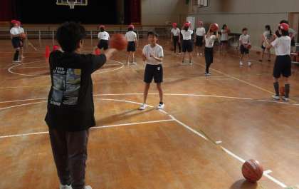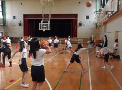 5年生が体育館でバスケットボールの学習をしています。