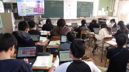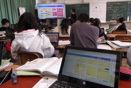 学習者用端末で先生に送信して、みんなで意見を共有しています。