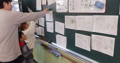 自分たちで「いろいろなのりもの」について調べたことを文章にまとめて、学習カードに絵と文章をかき、黒板にどんどんはりに来ています。