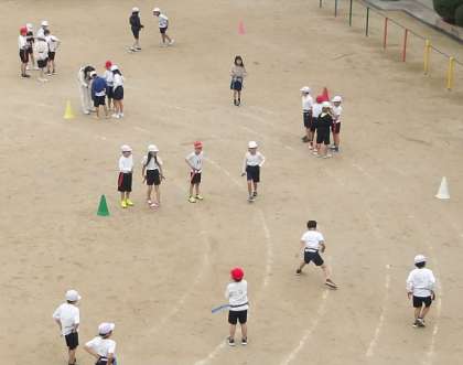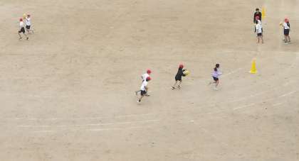 3年生が2クラスで運動場で「タグラグビー」の学習をしています。