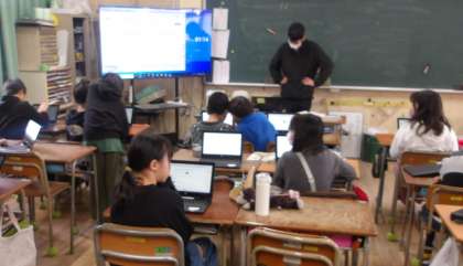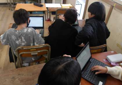 5年生が国語の「大造じいさんとがん」の学習で、学習者用端末を使って意味調べをしてまとめています。