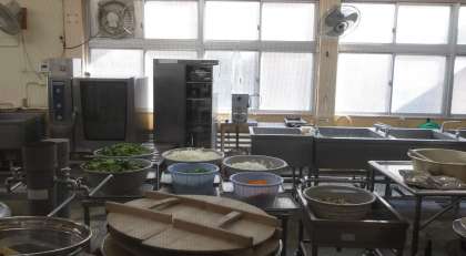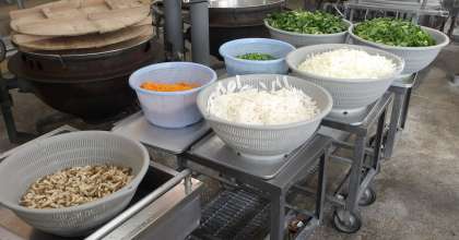 給食室では、今日のメニューの「和風カレー汁」の、きれいに切られたくさんの材料が置かれています。このあと次の工程が始まり、おいしい「和風カレー汁」ができ上がります。