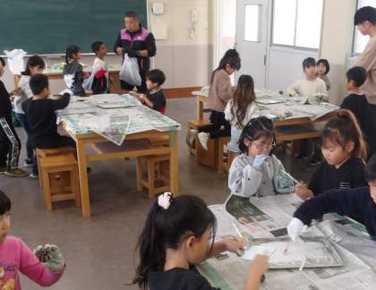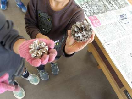 1年生は生活科の「秋をみつけよう」で集めた松ぼっくりに雪を降らせています。