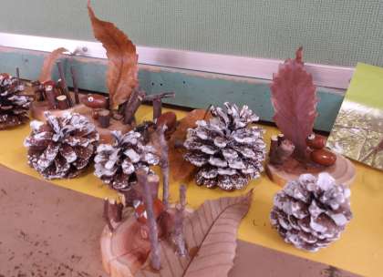 自然やどんぐりについて教えていただいたり、用意してもらったどんぐりなどの材料を使っていろいろな作品をつくりました。