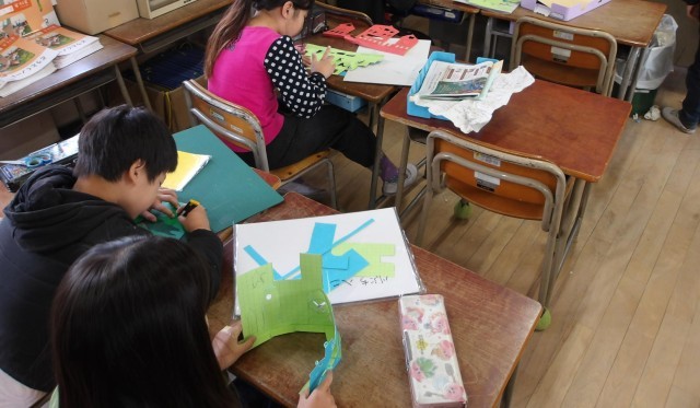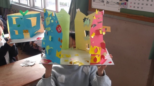 カッターナイフで色工作用紙を切って窓を作り、それを立てて自分だけの家やお城や塔を作っています。