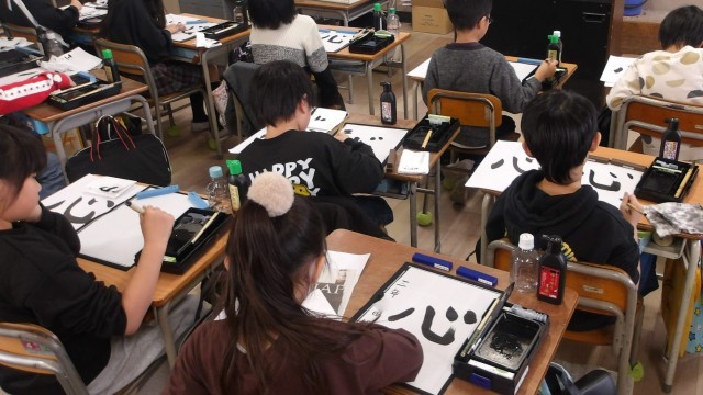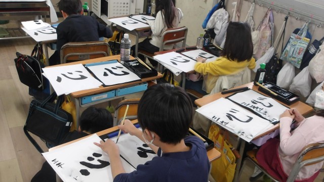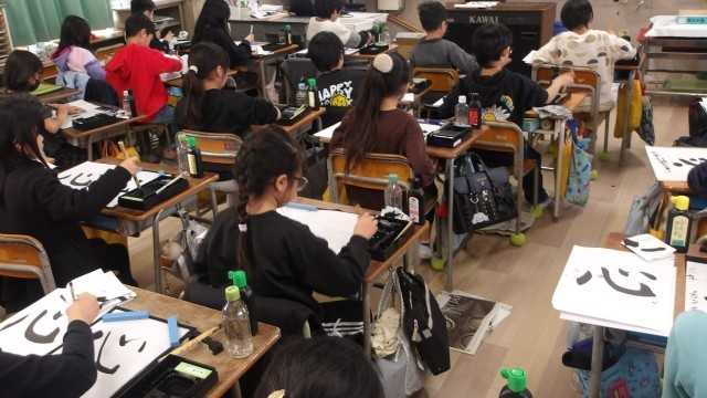 3年生が国語の習字の学習で、「心」の字を毛筆で書いている様子です。