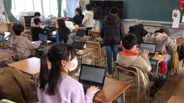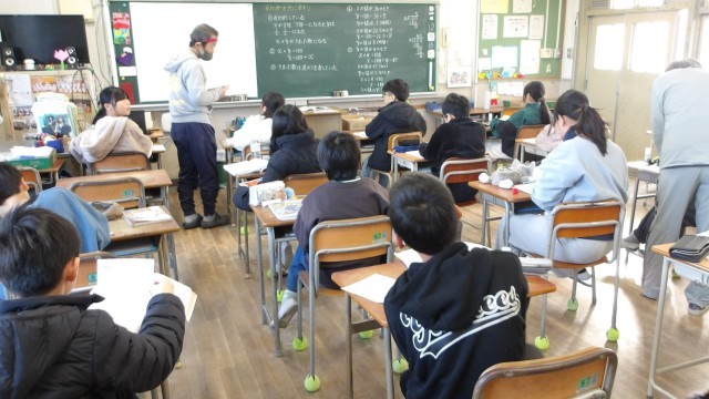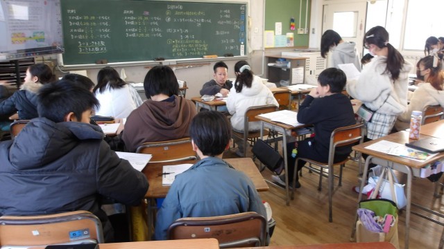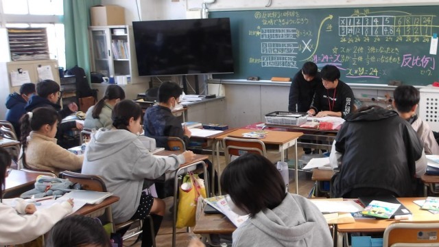 6年生の3クラスが、分割教室、6-1、6-2、6-3の4つの教室に分かれて少人数で、算数の「比例と反比例」の学習をしています。