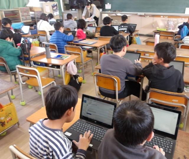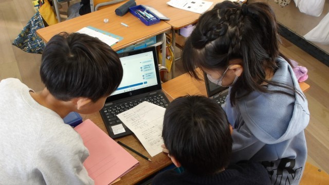 自分でプリントの問題を解いたり、自分で学習者用端末のデジタルドリルの問題に取り組んだり、友だちとデジタルドリルに取り組んだりと、それぞれのクラスごとに学習を進めていきます。