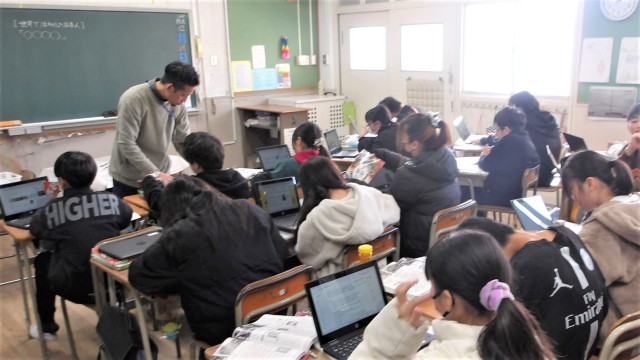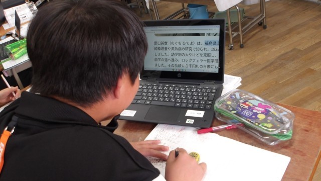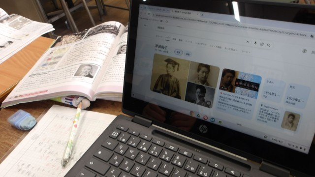 明治時代以降に世界で活躍した日本人について、教科書や資料集で調べたり、学習者用端末を使ってインターネットで調べたりしています。
