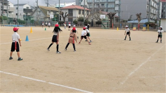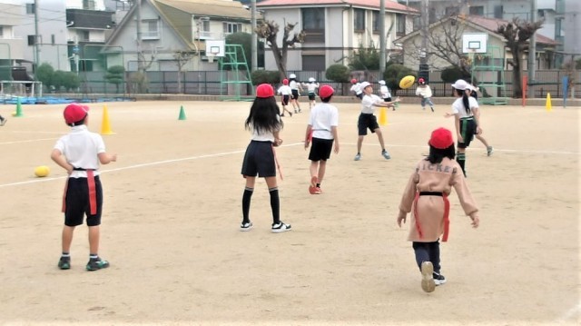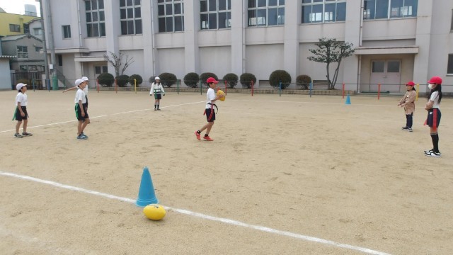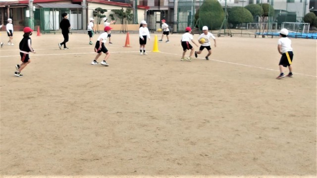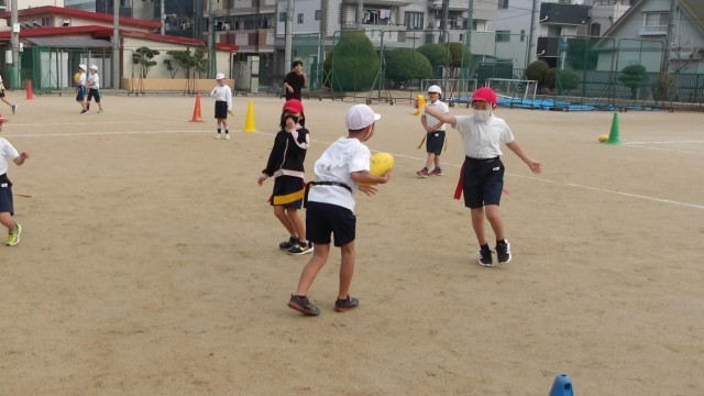 3年生が運動場で体育の「タグラグビー」の学習をしています。