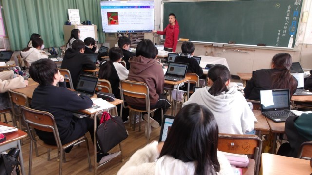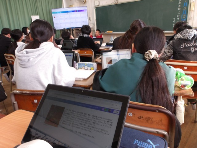 3組は、国語で、古典芸能について学習者用端末を使って調べていました。