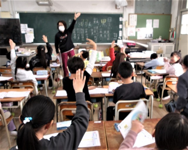 みんなで声をそろえて、新しい漢字の読みや使い方を確認したり、書き順を覚えたりしました。