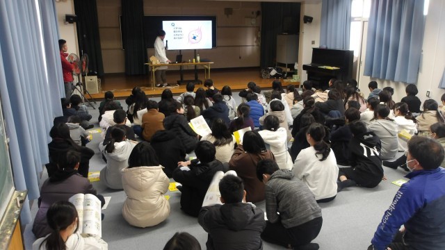 4時間目は学校薬剤師の先生に来ていただいて、6年全体で「薬の正しい使い方講座」がありました。薬の使い方やタバコの害などについて学習しました。