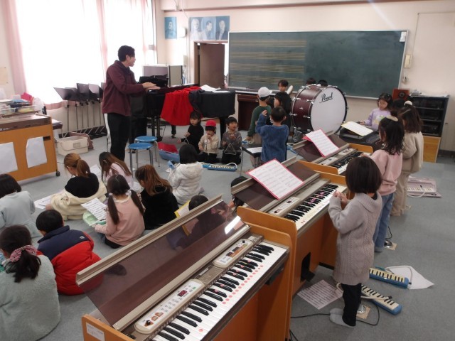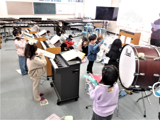 2組が音楽室で合奏の練習をしています。それぞれのパートで練習したり、みんなで合わせて演奏したりしました。とても上手に演奏できるようになってきました。