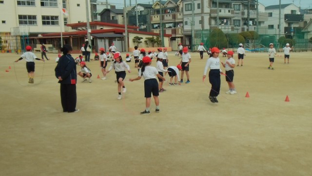 5時間目は、2年生全体で、運動場で体育でなわとびをしています。どんどん上達し、いろいろな跳び方にチャレンジしています。