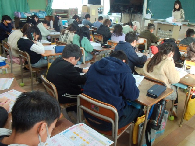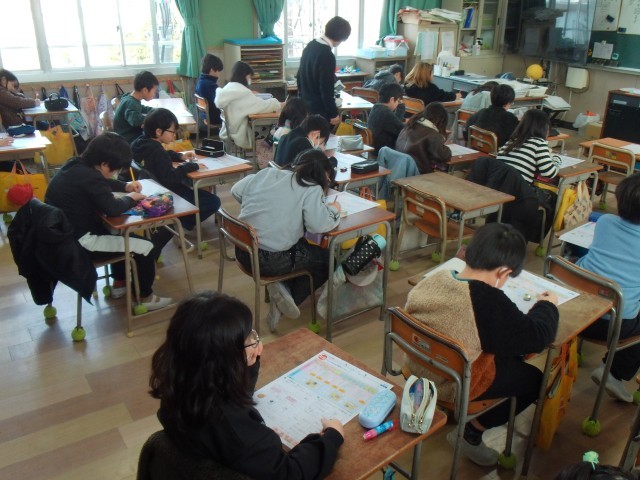 1時間目は2クラスとも社会のテストをがんばっていました。