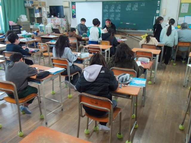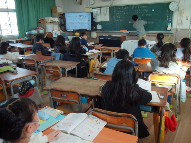 1時間目は算数でした。3つのクラスに分かれて「2けたのかけ算」の学習をしていました。