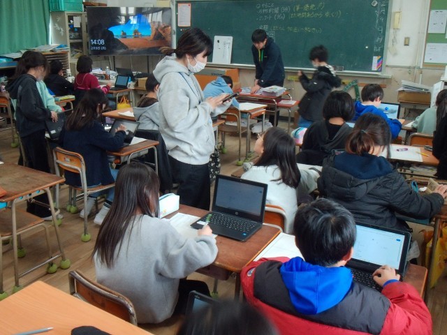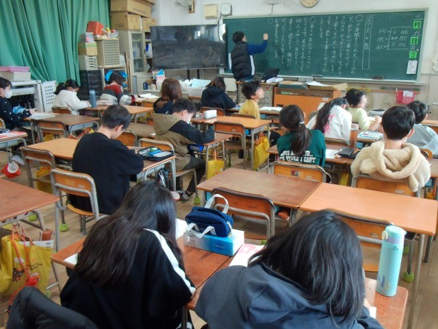 5時間目は、1組では音楽の合唱の練習をしていました。歌詞を覚えて気持ちを込めて歌っていました。2組では社会の「包丁作り」新聞を作ったり、学習者用端末でアンケートに回答したりする活動をしていました。