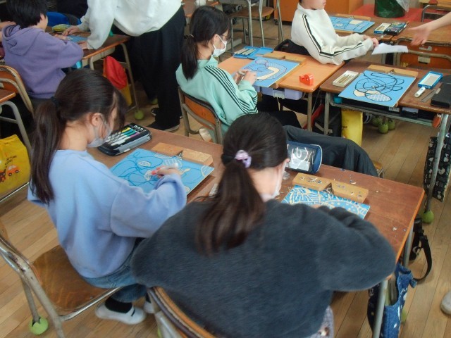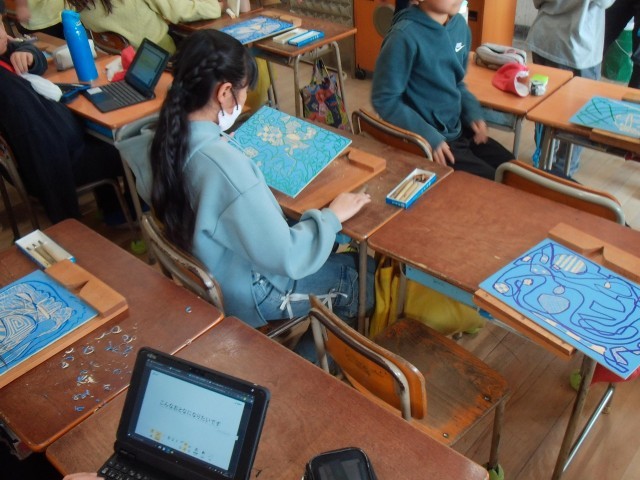 また、1、2組とも図工の「線の中に模様を見つけて」で、彫刻刀で木の板を彫っていました。