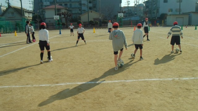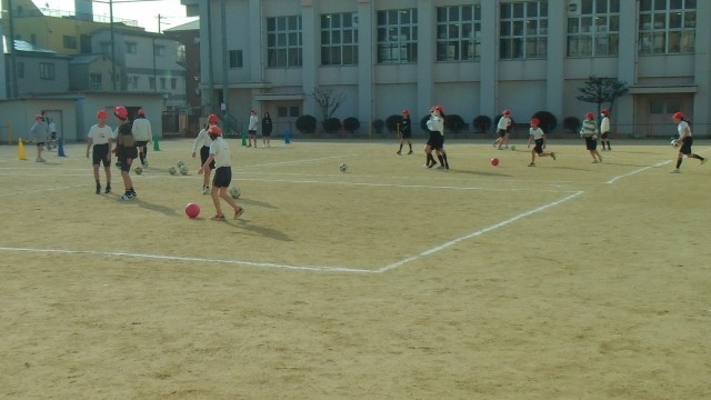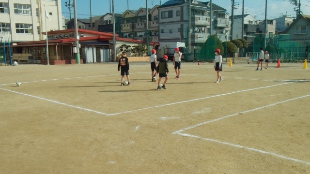 2組は、運動場でチームごとに「サッカー」の学習をしていました。
