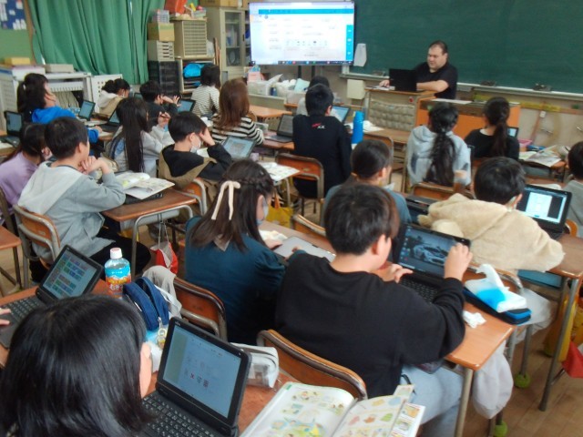 1組は、外国語活動の「This is my day.」で、1日にすることの英語の表現の仕方を、C-NETの先生と学習していました。