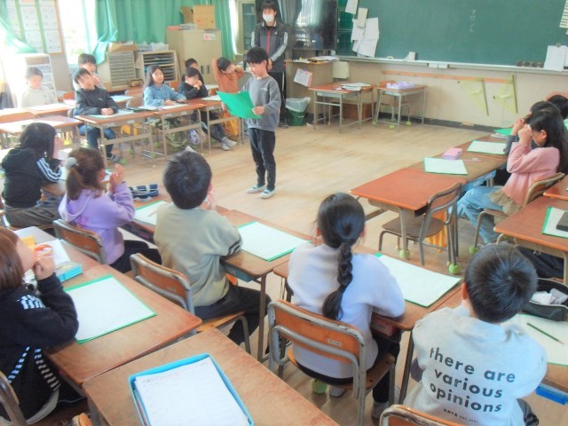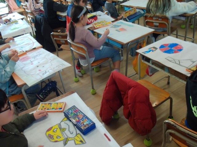 また1組は、図工で「作品袋」に思い思いに絵を描いていました。2組は、「わたしのたからもの」の発表の練習をしていました。