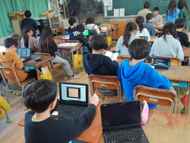 また、2組では、漢字の学習や学習者用端末のタイピングをしていました。1組では図工の「形の中のもよう」で彫刻刀で板をほっていました。