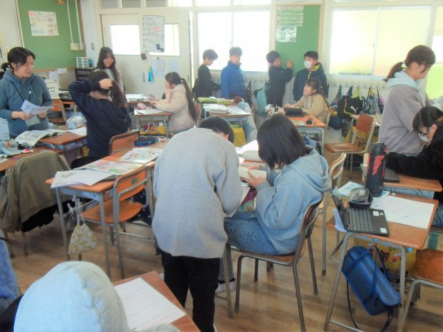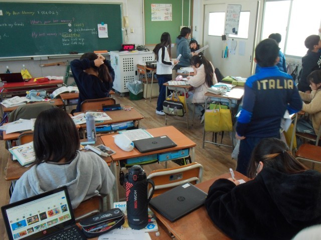 1組は、英語の「what's your best memory?」の学習で、思い出について英会話の練習をしていました。2組は、運動場で体育の「サッカー」のミニゲームをしていました。3組は、国語の「宇宙への思い」のまとめの学習をしていました。そして、6年の靴箱の靴はきれいにそろって置かれています。