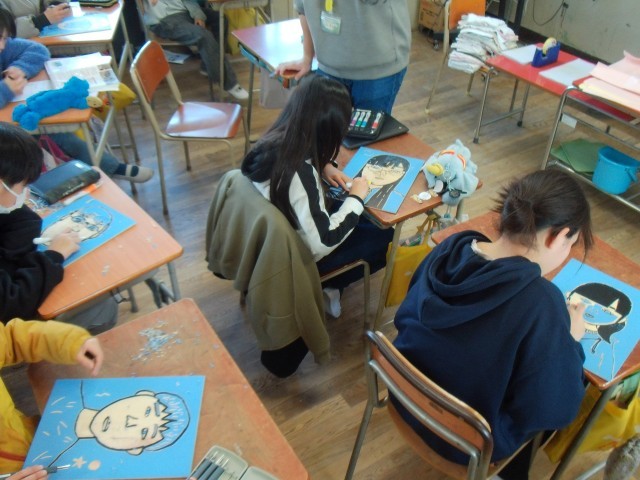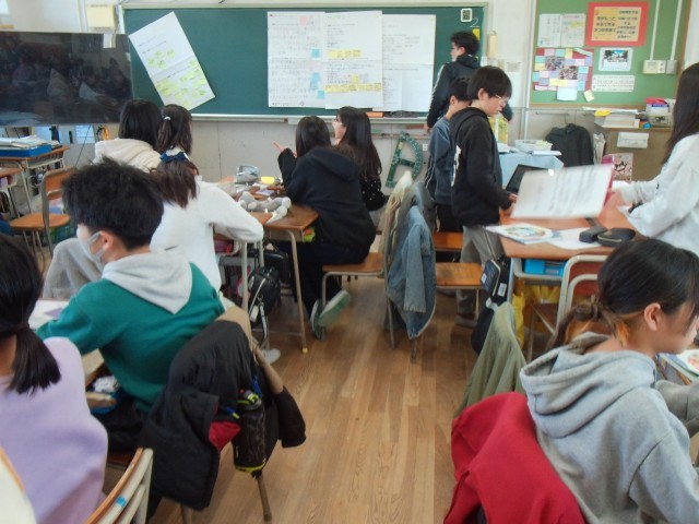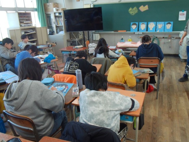 また、1組では図工で自分の顔の版画を彫っていました。2組は、理科の「ヒトのくらしと環境」のまとめの学習をしていました。