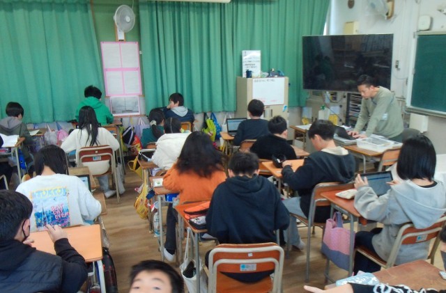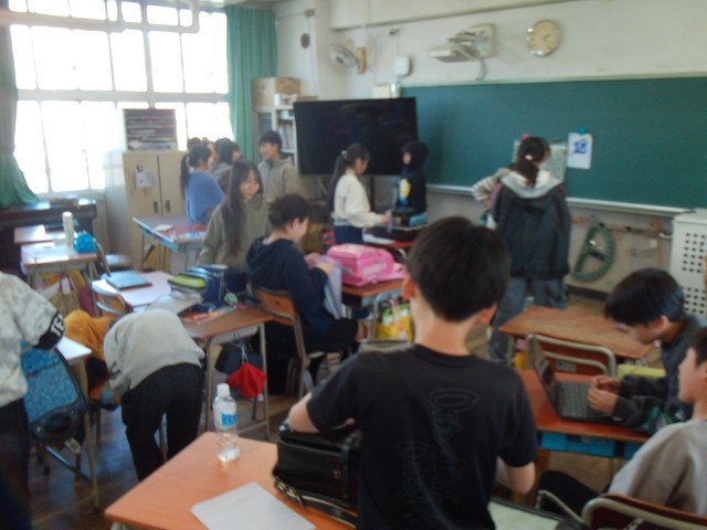 2組では、道徳の「いじめられる理由」の学習をしています。3組では、国語のテストが終わった人は学習者用端末で学習しています。1組では、帰る用意をしています。さようなら。