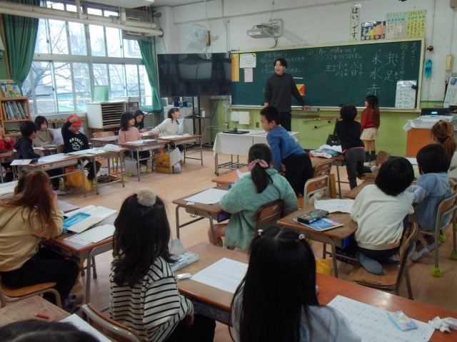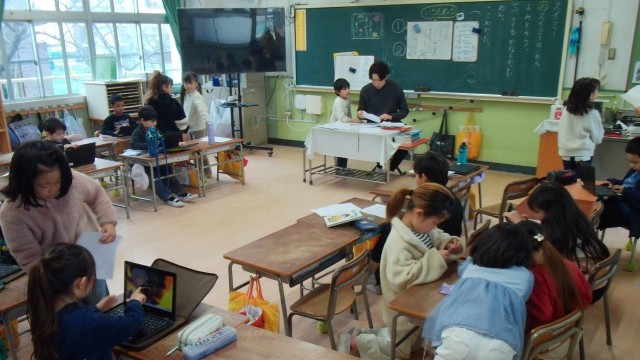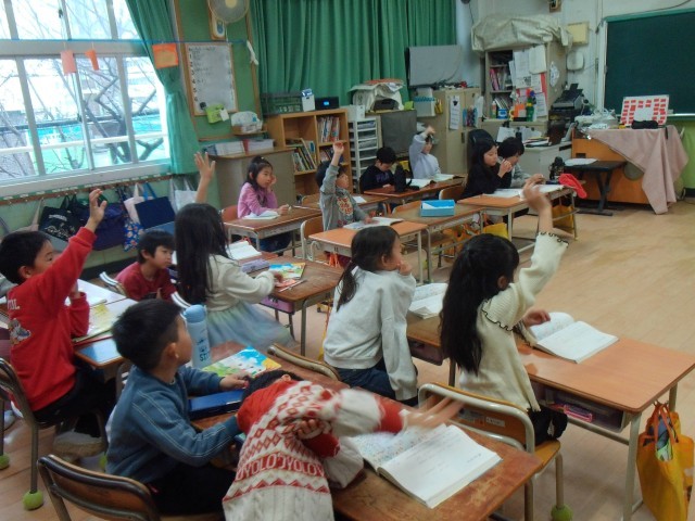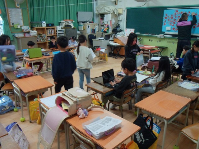 1年は朝の準備をしていました。また、1組は国語の「スイミー」の学習を、2組は漢字の復習をしていました。