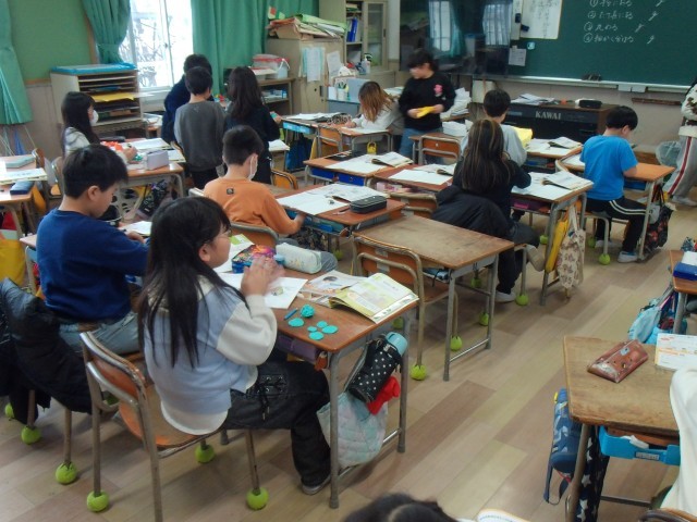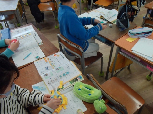 1組は算数の「ものの形と重さ」の学習で画用紙やねんどを使って重さをはかっていました。2組は習字で「水」を毛筆で書いていました。