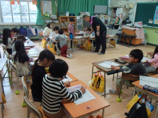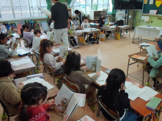 1組は算数の「かたちあそび」の学習を、2組は国語の「スイミー」の学習をしています。