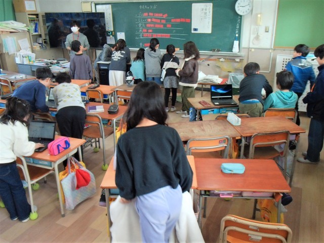 2組は、国語の「ゆうすげ村の小さな旅館」の内容についてグループで話し合っています。