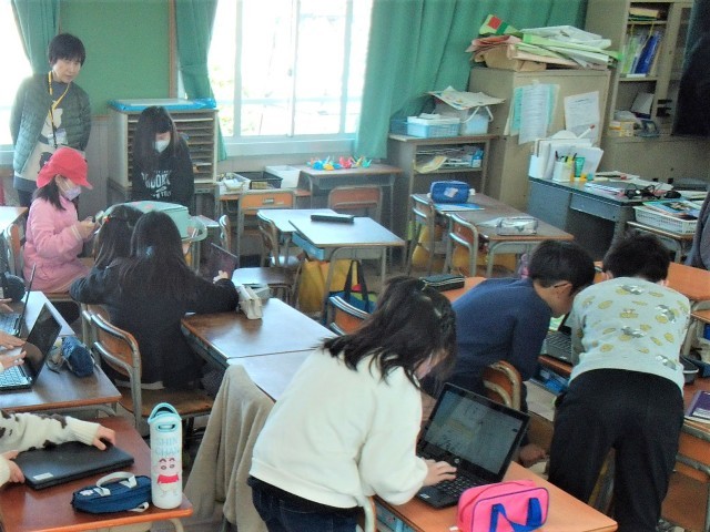1組は、「おもちゃランド」のおもちゃの作り方を学習者用端末で調べています。