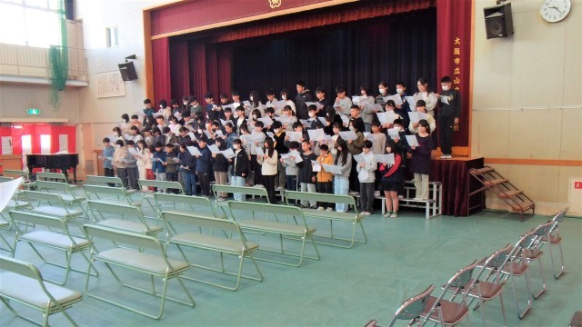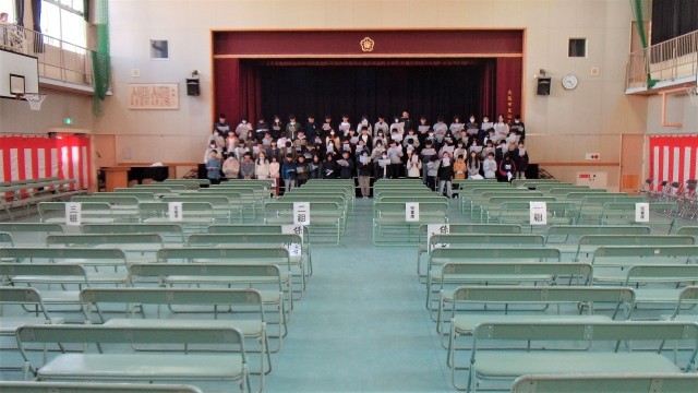 講堂で卒業式の「よびかけ」の練習をしています。大きな声でがんばっていました。さすがです!