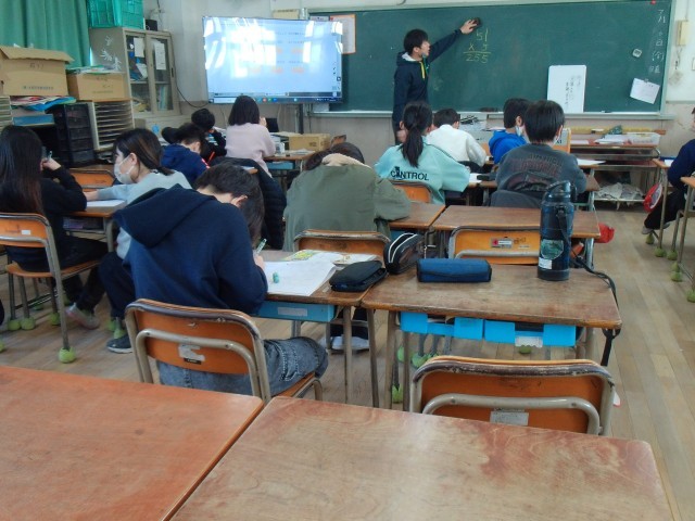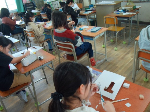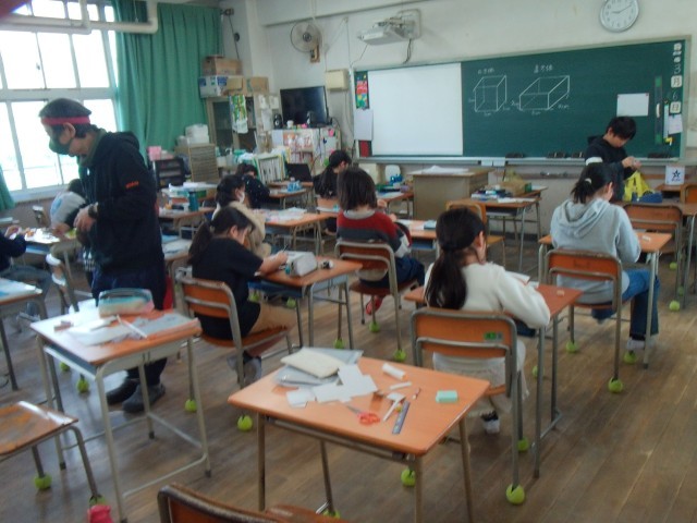 3つのクラスに分かれて算数の学習をしています。分割教室では方眼紙で立体を作っていました。