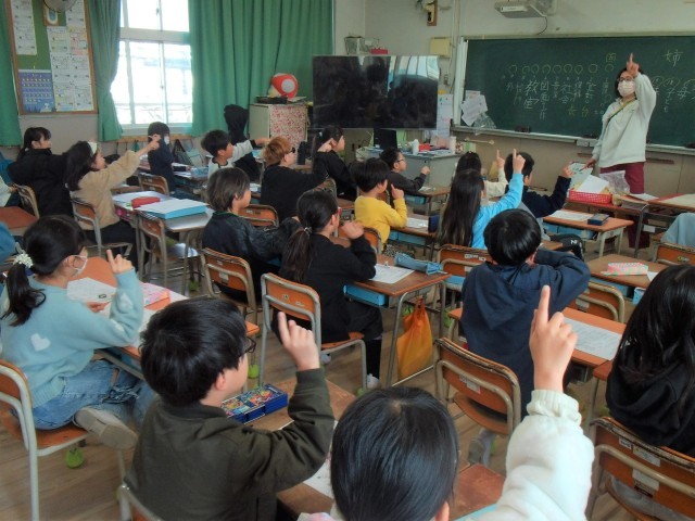 1組は、漢字の書き順の確認をしています。2組は、国語で「 」を使った文章を書いています。