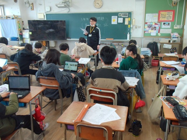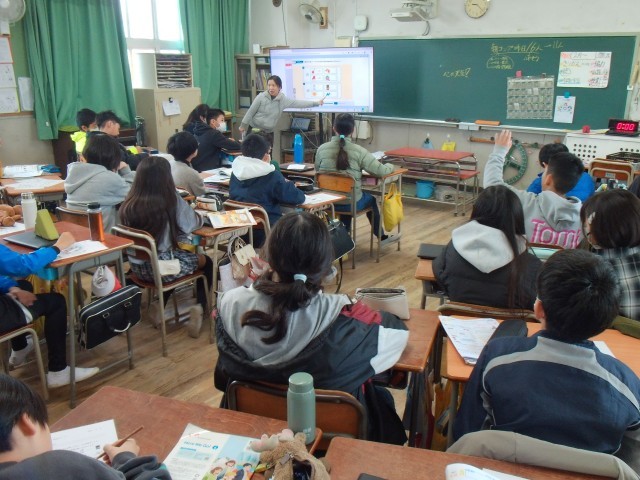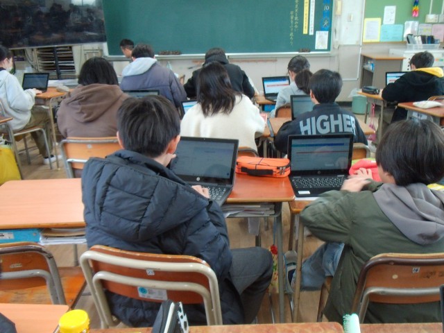 1組は英語のつづりの学習、2組は理科のまとめの学習、3組は国語の意見文の学習をしています。