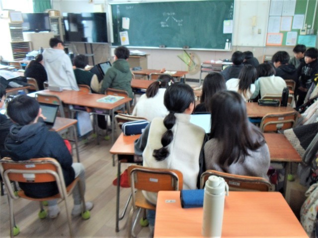 1組は理科でデジタルドリルをしています。2組では社会のテストが返却されています。「やったー!」「100点!」