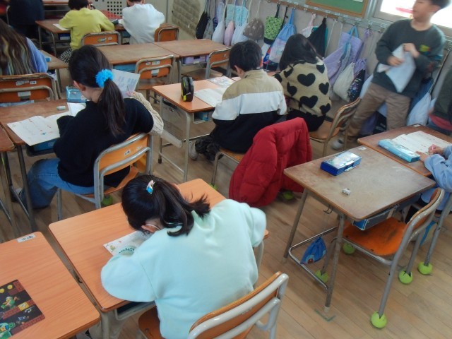 1組はえんぴつで書写をしています。2組は「お手紙」のテストを返してもらっています。