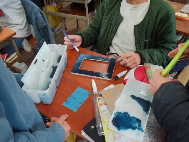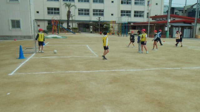 1組は運動場で楽しくサッカーをしています。2組は図工で写真フレームを作成しています。3組は理科のまとめをしています。