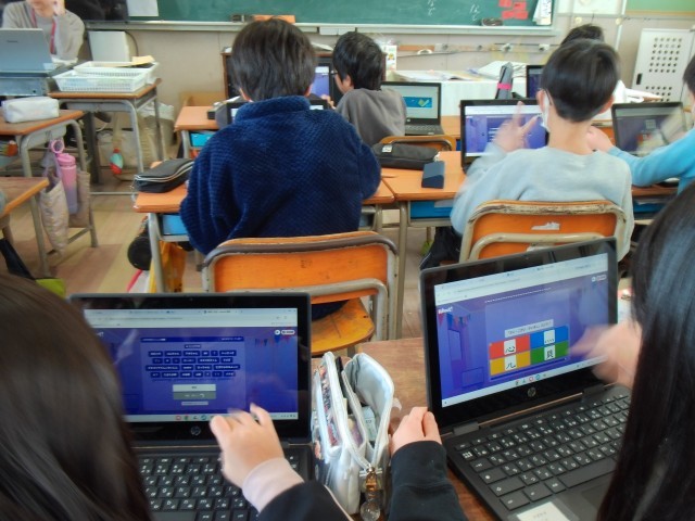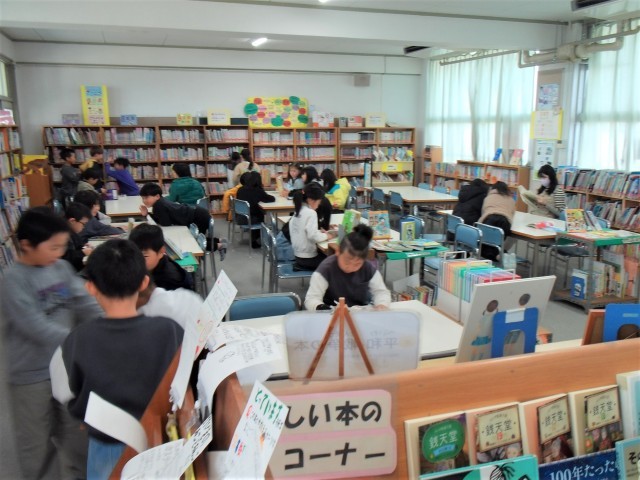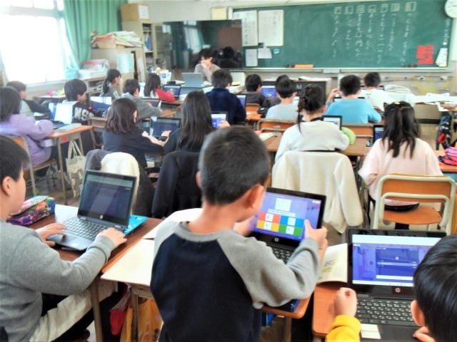 1組は学習者用端末を使って国語の「部首」の学習をしています。2組は図書室で本を読んでいます。